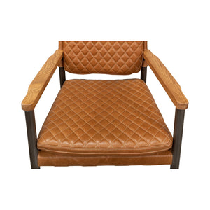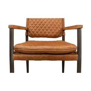 Mid-Century Modern style metal and leather armchair, sleek steel grey frame with wood arms, and quilted leather seat and back.