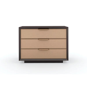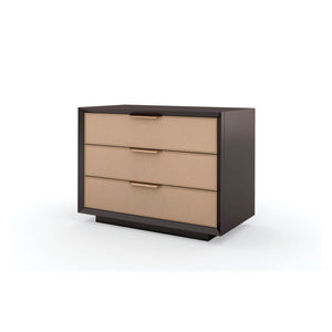 Mid Century Modern Three Drawer Nightstand, a clean-lined nightstand merges minimalism with elements of mid-century modern design. Framed in a contrasting Dark Chocolate finish, three soft-closing drawers feature textured vinyl fronts, embossed with a rivulet pattern like rain trickling down a windowpane.