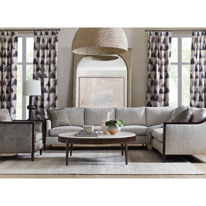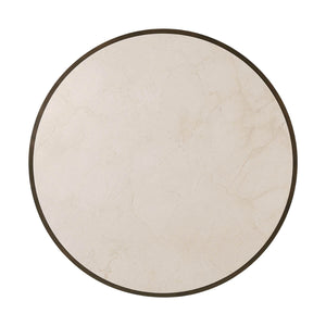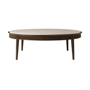 Mid Century Round Cocktail Table, in our Bistre finish and complimented by a beautifully honed inset Crema Marfil marble stone top, features a sophisticated tapered silhouette and reeded carved details.