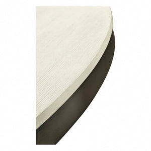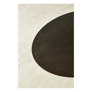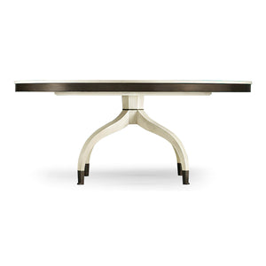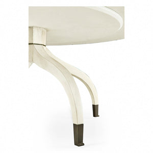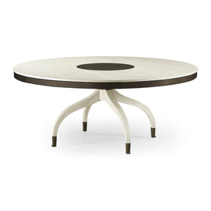 Mid Century Modern style round dining table in our Landstone country white finish. Accented with a Zinc fixed Lazy Susan, apron and ferrules on an unusual form sabre leg pedestal base.