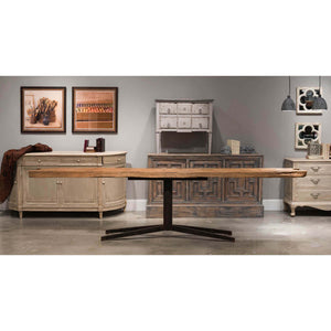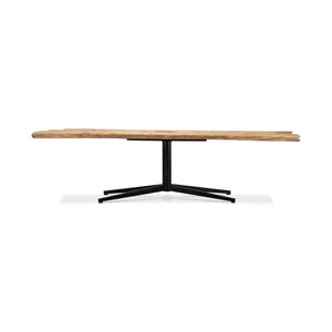 An Organic Modern plank top console table. The tabletop is crafted from genuine 19th-century antique elm planks recovered from a warehouse, it sits on an industrial modern iron base.