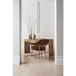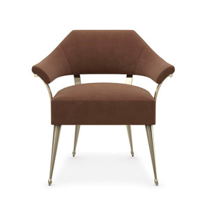 Modern Barrel Back Armchair, with an elegant silhouette inspired by a French antique. The chair adds classic warmth and a note of luxe with its slender frame in Champagne Gold and rust-colored mohair fabric with an exposed burl accent cinching the outside back.