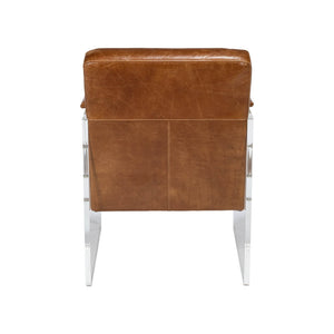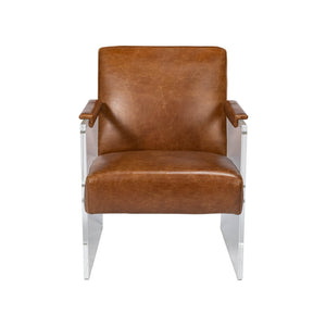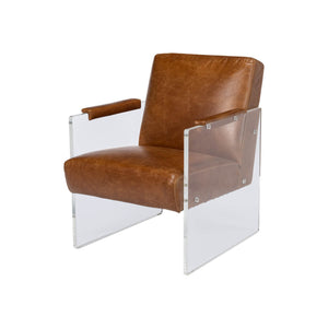 Step into the future of interior design with our Modern Brown Leather and Lucite Armchair, a bold fusion of avant-garde style and classic comfort. This chair features a sleek, Cuba Brown leather seat and backrest that provide a luxurious sitting experience, contrasted with clear acrylic side panels that give the illusion of floating in air.