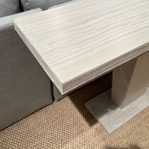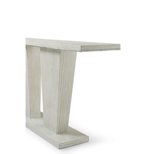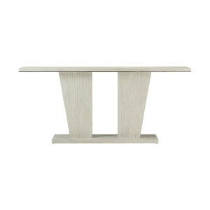 A Modern Coastal Console table, exquisitely crafted from quartered pine highlighted by a double pedestal base and decorative tapering supports in our wire brushed cerused pine Sea Salt finish.
