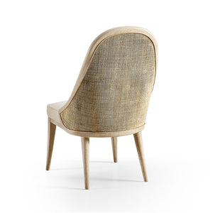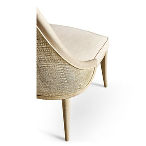 The creamy white performance fabric upholstery offers a luxurious seating experience, while the oak frame in a whitewashed finish provides both durability and refined coastal charm. Adding a unique touch, the chair’s outside back is wrapped in grass cloth, enhancing its natural organic appeal and textural depth. Ideal for upscale dining spaces, this armchair invites relaxation and style into every meal.