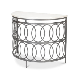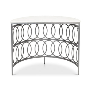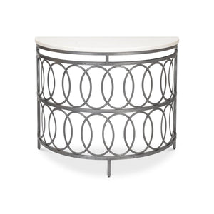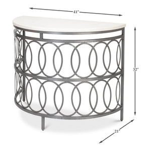 Elevate your interior with the Modern Industrial Console Table, a stunning fusion of Art Deco-inspired elegance and industrial charm. The striking demi-lune shape is framed by a meticulously crafted iron base, featuring an interlocking ring motif that adds geometric sophistication. The sleek, white Banswara marble top offers a luxurious contrast to the sturdy metal frame, making this console a timeless addition to any entryway, hallway, or living space.