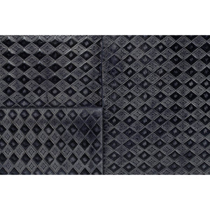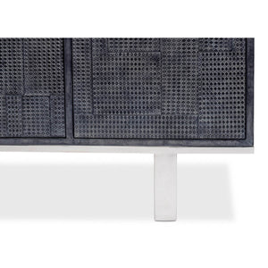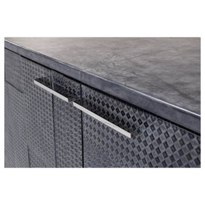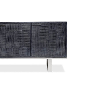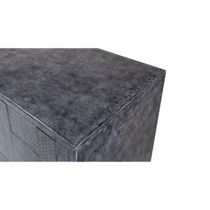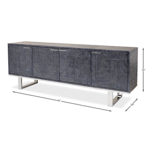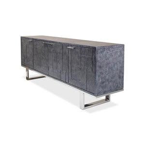 Modern Italian leather wrapped credenza, with an embossed grey/blue leather wrapped around the four-door cabinet with a natural wood finish interior and raised on stainless steel finish iron base.