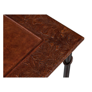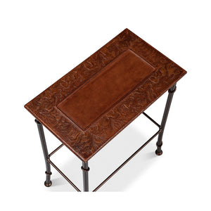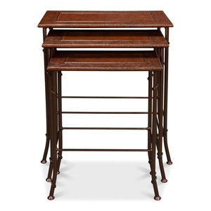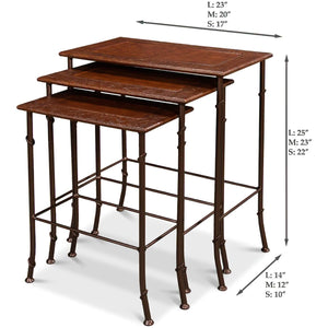 Modern Leather-Top Nesting Tables. The top of these tables features a hand-embossed design. Each table sits on hand-wrought metal legs with a faux bamboo style design. The tables have a graduated size for storage and use.