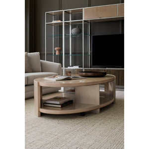 Modern Oval Two Tier Cocktail Table, with a refined oval shape, this cocktail table is a captivating addition to living interiors. Elevating its simple form, a Thunder finish gives light to the linear wood grain, accentuated by metal trim in soft silver paint.