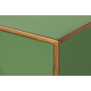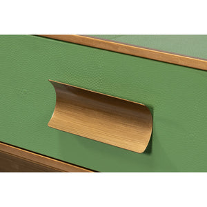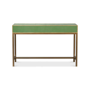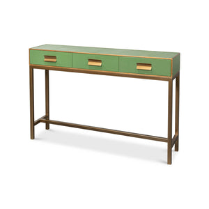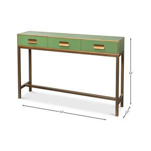 Elevate your interior with our Modern Watercress Green Leather Wrapped Console. This piece, beautifully crafted with a luxurious leather exterior in a bold watercress green, is accentuated with delicate gilt trim, adding a hint of glamour to its modern design. The console measures 54" W x 12" D x 34" H, fitting seamlessly into various spaces.