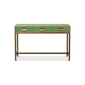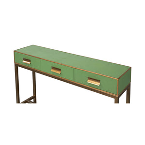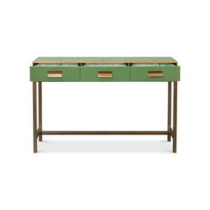 This console boasts three frieze drawers, each lined with marbleized interiors, a detail that speaks to the sophistication and attention to detail in its craftsmanship. The drawers are fitted with brass handles, offering a stunning contrast against the green leather and enhancing its overall elegance.