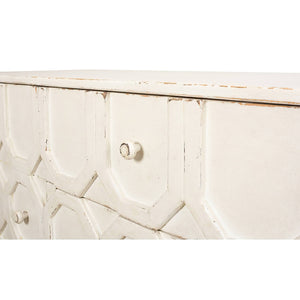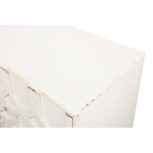 A modern geometric sideboard. This front has a unique applique design with patterns of octagons running down the center. It has two doors and a bank of three drawers in the center.