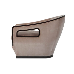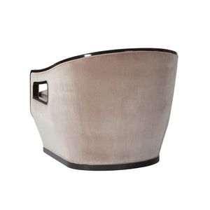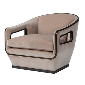 A French Modern Style upholstered swivel club chair with lacquer accents. This chair has an elegant modern design. The upholstered body is accented with sleek lacquer accents around the chair and at the base. It has one loose seat cushion with a tight back.