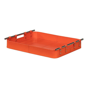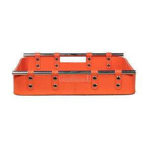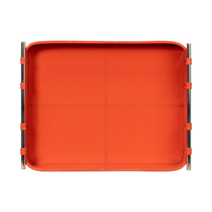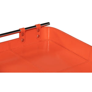 Orange Leather Tray, with a bold orange leather, this leather tray is fraught with detail: the topstitching of each leather panel, the narrow leather straps that hold the stainless steel handles in place.