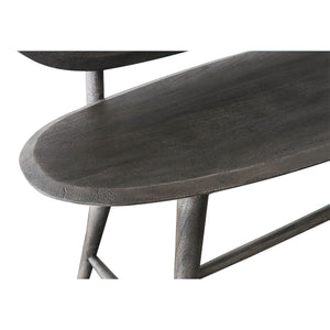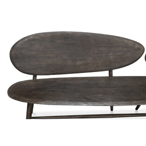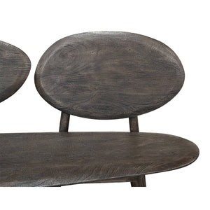 An organic modern greyed wood bench. This bench has a flair for the arts and is inspired by boulders and pebbles found in natural landscapes. It is hand-crafted and carved out of solid acacia and has a natural finish. Its unique abstract design makes it a true conversation piece.