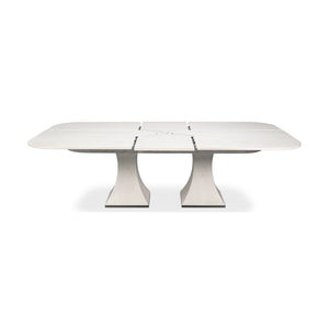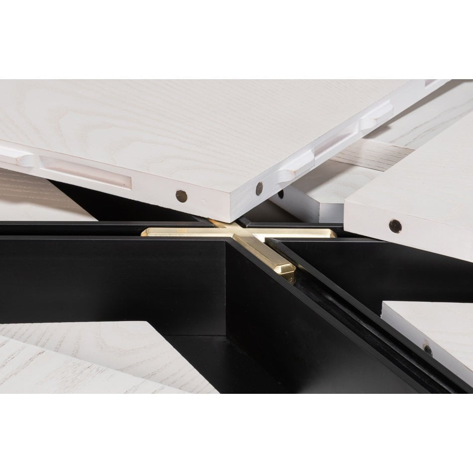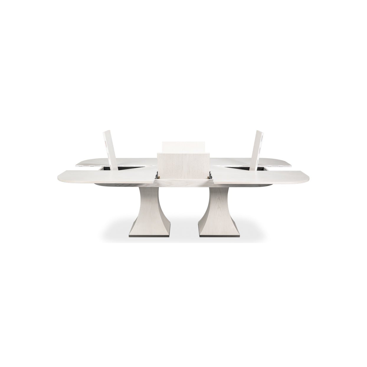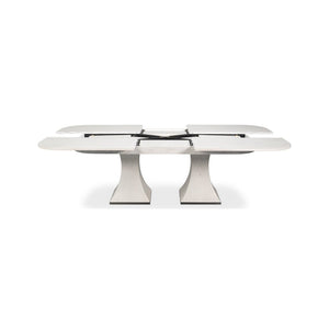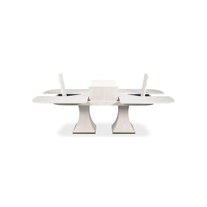 The Rectangular White Jupe Dining Table makes an unforgettable statement in style, beauty, and functionality. Finished in working white on Ash veneer, its unusual rectangular jupe design combines architectural elegance with modern practicality. The self-storing expansion mechanism, crafted from extruded aluminum, allows effortless operation and expands the table to accommodate up to 12 guests when fully extended. A book-matched veneer top with geometric patterning further enhances its sophisticated appeal.