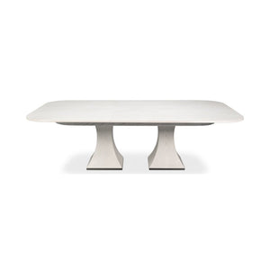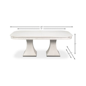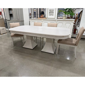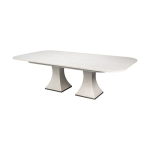 The top rests on two flared pedestal columns, each accented with a brushed stainless band at the base. This sculptural silhouette blends Art Deco influences with contemporary design, offering both glamour and durability. Perfect for formal dining spaces, it transforms effortlessly from intimate gatherings to large celebrations while maintaining its striking presence.