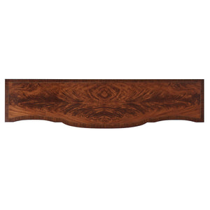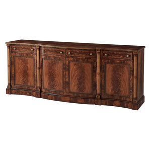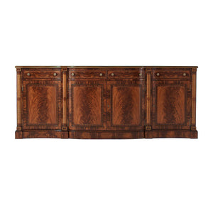 A fine Regency Serpentine Credenza with flame mahogany and Morado banding, with fine double stringing in sycamore and ebony, the serpentine crossbanded top above four frieze drawers, above four paneled cabinet and lockable cabinet doors flanked by fluted inlaid rounded columns, on a shaped plinth base.