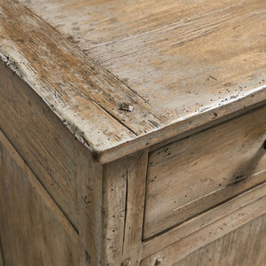 The sideboard offers practical storage with two upper drawers and four doors, each with carved panels and adjustable shelves inside. Hand-cast metal knobs and textured pulls add a crafted feel, while mitered corners and a smooth top edge give it a simple, elegant look. This piece adds warmth, character, and useful style to dining rooms, living areas, or farmhouse-inspired spaces.