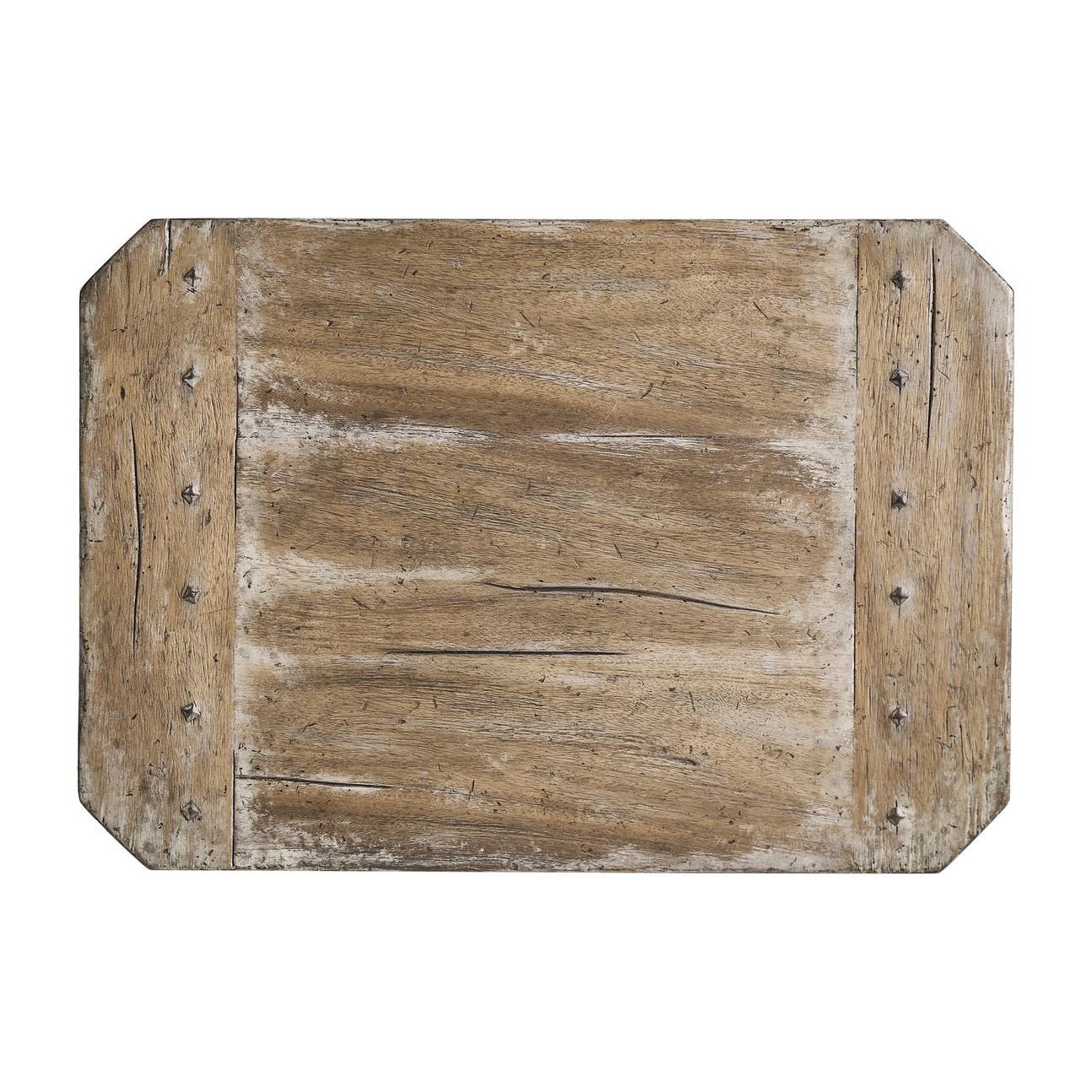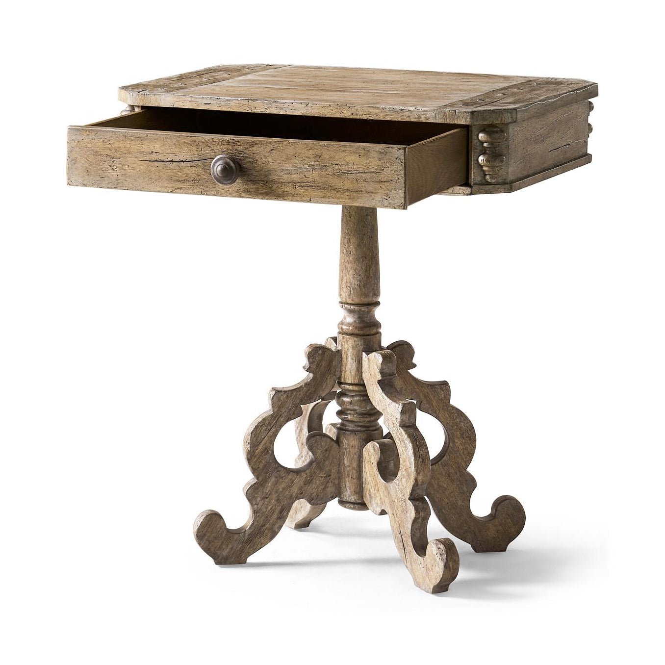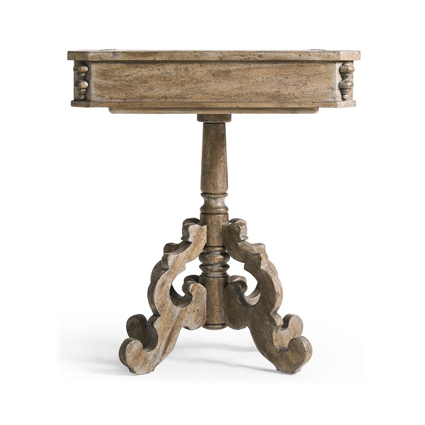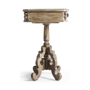 The Rustic Oak French Country Pedestal Side Table brings refined, old-world charm to intimate spaces. The table showcases a warm, time-worn finish over greyed oak, highlighting its sculpted pedestal base and intricately shaped feet that echo Spanish-inspired craftsmanship. A softly beveled top and subtle painted accents add quiet detail, enriching its heirloom character.