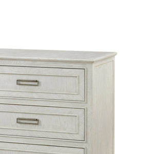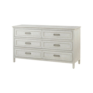 The Six Drawer White Oak Dresser offers a refined take on casual elegance, blending modern lines with classic craftsmanship. Constructed from oak and finished in a soft white dover finish, this piece highlights the natural beauty of the wood grain with subtle chevron parquetry. Six spacious drawers provide ample storage, each adorned with rectangular metal pulls in a brushed finish for a clean, contemporary touch.