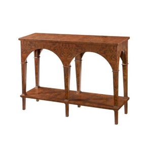 The Small Burl Walnut Console Table combines architectural elegance with casual sophistication, rich walnut burl wood grain radiates natural warmth and beauty. The design showcases two graceful Gothic-inspired arches supported by tapered columns, creating a rhythmic visual element that defines the piece.