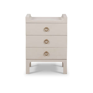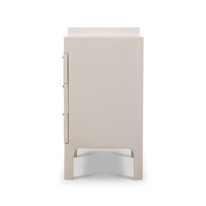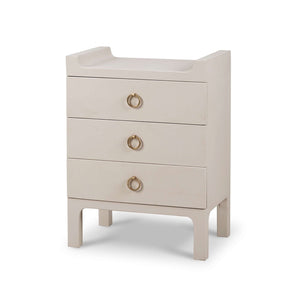 Introduce sleek elegance to your home with this Small Linen Wrapped Modern Scandinavian Nightstand. Crafted with a minimalist design, this stand features clean lines and a chic, putty-colored linen wrap that perfectly captures the essence of Scandinavian style. The three drawers, adorned with brass handles, provide ample storage for your bedside essentials, making it both a stylish and functional addition to your bedroom.