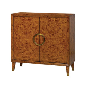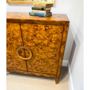 Transform your living space with the timeless elegance of the Small Mid-Century Burl Cabinet. With its warm 'rustic' hand-rubbed mappa burl veneer, this cabinet emanates a sense of timeless beauty. The beveled frame showcases the attention to detail that went into its creation, while the polished brass central round handle adds a touch of luxury.