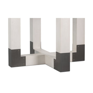 The sculptural pedestal base features intersecting supports, accented with brushed stainless steel details at the feet, offering both stability and a touch of glamour.