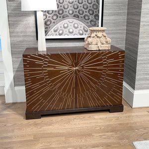 Elevate your interior with this exquisite Starburst Art Deco Cabinet, a true masterpiece that blends timeless elegance with modern sophistication. Set upon a robust mahogany base, this two-door cabinet exudes luxury and style. The starburst brass inlay pattern, meticulously designed across the doors and case, is showcased in our elegant Gelato finish, adding a touch of glamour to any room.